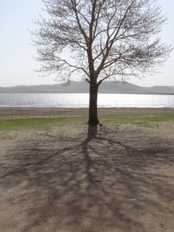 (靜靜的閃電湖邊,兩棵樹,相偎相依,陽光為媒,穿著灰衣。)
