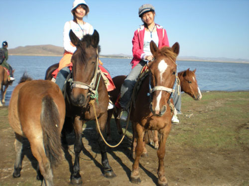 我們騎的那兩匹馬又餓又渴了,騎到湖邊就往水里走,喝水~